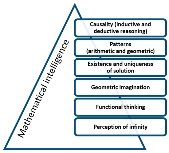 Juter and Sriraman [54] identified several different features for defining mathematical intelligence. In studies in the domain of cognition, mathematical intelligence in an individual can be defined as: (1) An ability to recognize, abstract, and generalize mathematical structures; (2) data handling; (3) an ability to think logically and to infer; (4) analogical, heuristic thinking, and posing related problems; (5) flexibility and reversibility of mathematical operations; (6) an intuitive awareness of mathematical proof; (7) an ability to discover mathematical principles independently; (8) decision-making abilities in problem solving situations; (9) an ability to visualize problems and/or relations; and (10) capacity to distinguish between empirical and theoretical principles. These abovementioned aspects can be covered by the following two terms such as: (1) causality, including inductive, and deductive reasoning, and (2) existence and uniqueness of solution. It is worth to mention that talented pupils, as a rule, manifesting high levels of logical-mathematical intelligence are often “fascinated with unique patterns in numbers or with science as such and will pursue ideas far beyond their apparent utility” [55]. These pupils are also able to internalize ample intricacies of logic and mathematical reasoning [56], particularly, in the field of geometry and algebra, thus they feature sole geometrical imagination and well-developed ability to recognize the patterns as such [57], whether in the field of algebra or geometry, so, it seems to be the promising factor influencing the pupils’ ability to solve mathematical problems. Our previous findings [51] indicate that functional thinking and perception of infinity are just the two aspects particularly involved in the successful solution of mathematical problems. Mathematical intelligence is defined here as a specific sensitivity to the following six specific phenomena: causality, patterns, existence and uniqueness of solution, geometric imagination, functional thinking, and perception of infinity (Figure 1).