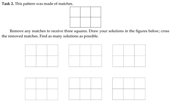 The test of mathematical intelligence consisted of the 12 specific problems. Always two problems correspond to one particular phenomenon of the definition of mathematical intelligence, specifically covering such aspects as: causality, patterns, existence and uniqueness of solution, geometric imagination, functional thinking, and perception of infinity. The items in the test were collected from several sources, using the Vanderberg and Kuse Mental Rotation Test [77], the Guilford test of Divergent Thinking, and in addition using a figural item of the Torrance Creativity Test [78]. However, all these selected tests are based on the Eysenck Intelligence Test [79].
