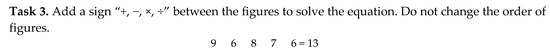 Nine of the test items were closed multiple-choice tasks with only one correct answer, two items were the short answer items with unique solution, and one item has more correct solutions. Five of the items were divided into smaller parts. Each item was assessed on the scale 0–5 based on strictly defined criteria and the total sum indicated the index of mathematical intelligence. Initially, each of the three coders were trained by coding ten of the pupils’ solutions and confronting their coding with the authors of the test. The three of the test items are presented (Figure 2, Figure 3 and Figure 4). The test lasted 15 min. All the tested pupils worked independently, they were allowed to use only simple calculators. All the problems of the test were evaluated by the authors of this paper. The test was validated in the Czech educational environment [53]. Here, the reliability level of the entire test is which allows to consider the reliability as sufficient.