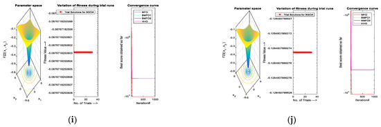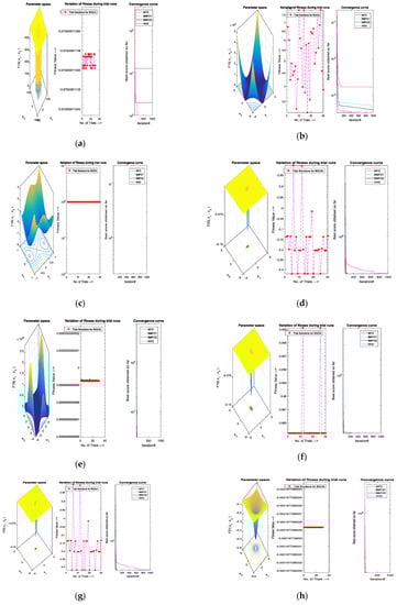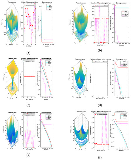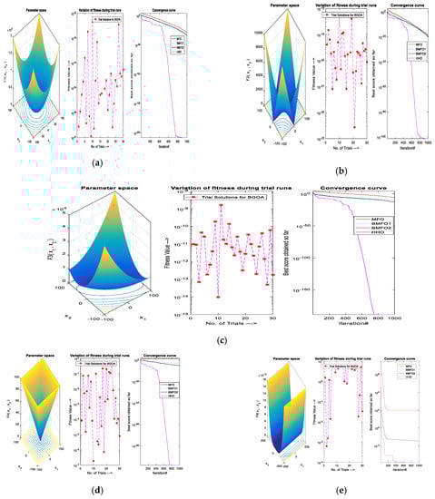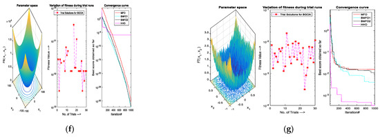 The convergence curve and trial solutions for BMFO1, BMFO2, and HHO for f1 to f7 unimodal benchmark functions are presented in Figure 5a–g.
