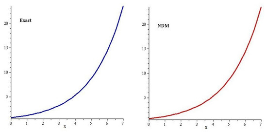 Exact and NDM solutions at of Example 1.