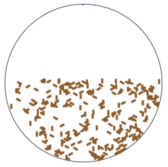 At the beginning of the simulation, the wood particles are located at the bottom of the resonating mixer and are stationary. In Figure 6a the initial positions of the wood particles are shown. When the mixing arm starts to move, the wood particles are stimulated. In Figure 6b, the positions of the wood particles and adhesive droplets after s are shown.