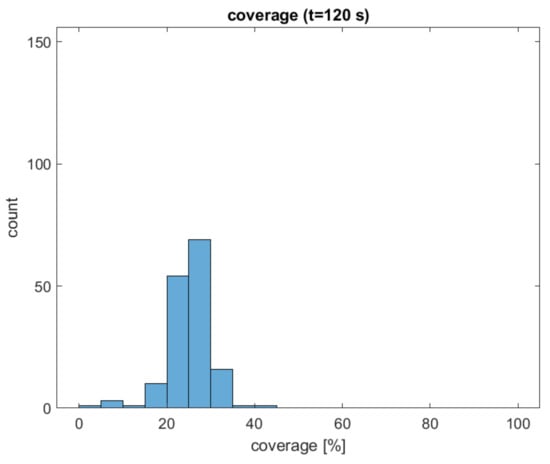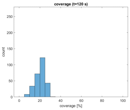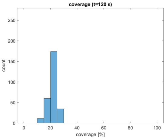 During the simulation, about 140,000 collisions of wood particles take place per second and about 250 of these include a transfer of adhesive. About 120 collisions of wood particles and adhesive droplets occur per second. The significant difference in the number of collisions can be explained by the fact that wood particles can collide an arbitrary number of times while an adhesive droplet can only be involved in exactly one collision with a wood particle. After about s the relative frequency of wood particles with at least one adhesive droplet is . In Figure 5 the distribution of coverage at the end of the simulation is shown and the mean coverage is about at this time step. At the end of the simulation the diameters of adhesive areas range from to m with a mean of m.