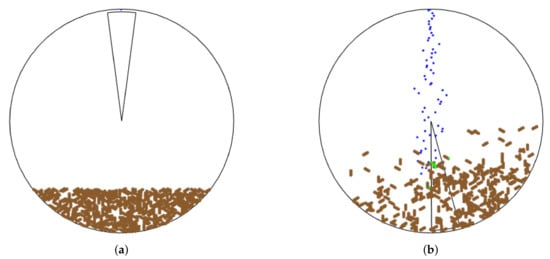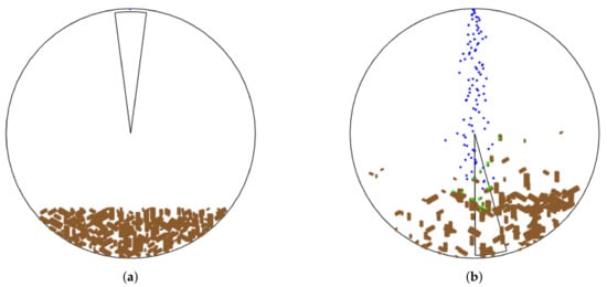 In the following, the general assumptions for all scenarios are presented. The lattice has a grid width of cm and covers a diameter of 40 cm. The simulation time is 120 s. The general properties for the wood particles and the total mass of wood are given in Table 1 (for scenario 1, initial position and initial velocity differ). As stated in Section 2.1, softwoods are mainly used for particleboard production. Therefore, a typical value for the raw density of spruce, which is a common softwood species, is used. The general properties for the adhesive droplets and the total mass of adhesive are given in Table 2. The amount of adhesive applied was (g of solid adhesive to g of absolute dry wood) in the underlying recipe the simulations were based on.
