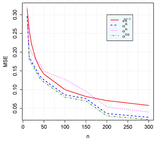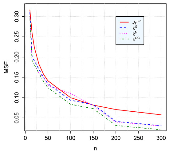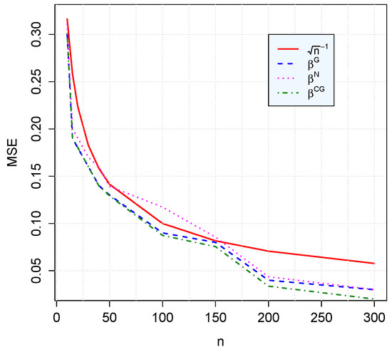 As we see in these figures, the MLEs of the parameters and k obtained by Newton’s, gradient and conjugate gradient methods are -consistent. And we can say that the conjugate gradient method gives the best results. In this way, we have numerically checked the well known properties of MLEs, namely the consistency and asymptotic normality, by verifying that the values of the mean square errors obtained are -consistent, which confirm the theory of the method used.