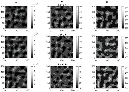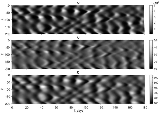 Spatiotemporal dynamics of variables R, N, S at section of domain .