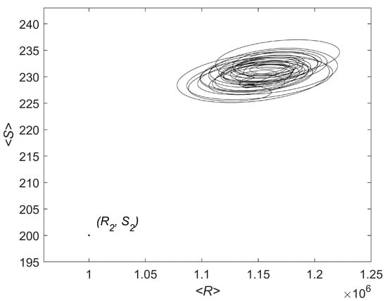 Figure 3 presents projection of the model trajectory onto the plane of the above-defined spatially averaged density of microalgae and individual satiety of harpacticoid. The trajectory demonstrates chaotic oscillations that correspond to stabilized dynamics of the model.