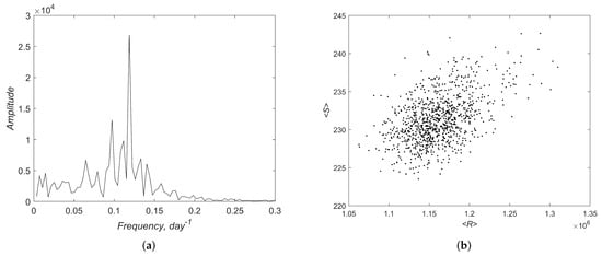 Noteworthily, point representing in Figure 3 spatially homogeneous solution , is situated noticeably to the left and below of the domain occupied by the migration-model trajectory. In other words, this stationary homogeneous state which is stable without prey–taxis, corresponds to the situation of overgrazing (permanently low abundance of prey tightly controlled by permanently hungry predator). Due to their spatial feeding behavior, harpacticoid copepods increase both individual consumption and density of microalgae population, by maintaining spatially-heterogeneous dynamics of the ecosystem. We have also computed the Fourier transform of the average prey density and built the projection onto the phase plane of the Poincaré section defined by the hyperplane . The results of these computations shown in Figure 4 provide additional evidences of complexity of the simulated dynamics. In particular, Figure 4a shows a broad banded amplitude spectrum over a large frequency span what is a typical indication of chaos (compare this spectrum with plot obtained for clearly periodic dynamics in Figure A3). The cloud-like Poincaré map in Figure 4b, which does not consist of either a finite set of points or a closed orbit, presents another sign of chaotic behaviour of the model (see, e.g., []). Additionally, the Fourier analysis reveals presence of a periodic component in simulated oscillation; there is a peak amplitude at frequency 0.1188 which corresponds to dominating period of 8.42 days.