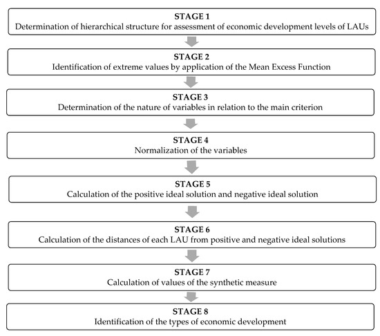 Proposed multiway procedure includes four approaches based on TOPSIS [36] and MEF (see e.g., [37]) to assess the economic development level of LAUs at different government levels. This process includes the construction of a synthetic measure which enables a synthetic assessment of a phenomenon described by multiple variables. It consists of eight key stages (Figure 1).