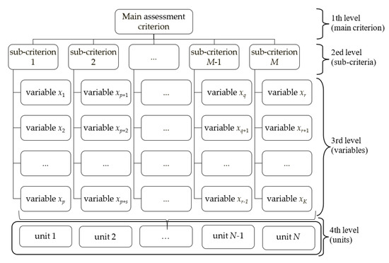 Particular attention should be paid to selecting the variables. For this purpose, they need to be validated in substantive and statistical terms. Substantive validation precedes statistical ones. The substantive analysis may rely on expert opinions, the researcher’s knowledge of the issue concerned, or guidelines developed as part of theories of economic phenomena (see [38]). Once the substantive validation is complete, in statistical analysis descriptive statistics can be used, including e.g., arithmetic mean, variance, correlation coefficient. The analysis of the inverse correlation matrix between values of variables where facilitates the elimination of variables strongly correlated with each other. If some values are excessively correlated with other ones, the elements on the main diagonal are much greater than ten [39]. Excessively correlated variables are eliminated from the initial data set. Main assessment criterion is a primary standard for judging or assessing complex phenomenon (first level). Sub-criteria are set of related factors related to main criterion (second level). Each sub-criterion is described by package of variables (third level). All variables describe each unit (fourth level).