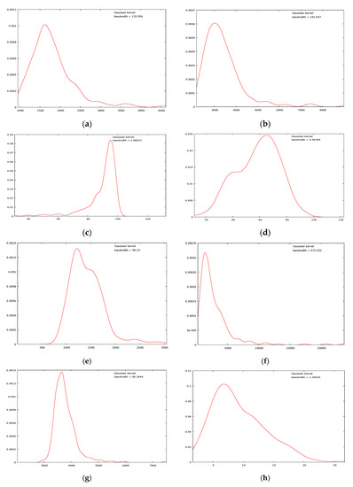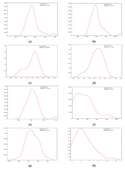 (a) Estimated density for the variable x1—own revenue of municipal budgets in the district at national level. (b) Estimated density for the variable x2—population per public pharmacy at national level. (c) Estimated density for the variable x3—share of population served by water supply at national level. (d) Estimated density for the variable x4—share of population served by a sewerage network at national level. (e) Estimated density for the variable x5—entities of the national economy per 10,000 of population in working age at national level. (f) Estimated density for the variable x6—investment outlays in enterprises per capita at national level. (g) Estimated density for the variable x7—average monthly gross wages and salaries at national level. (h) Estimated density for the variable x8—registered unemployment rate at national level.
