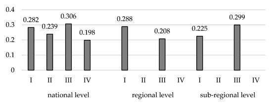 Values of homogeneity measure according to approaches and different government levels. Note: II and IV approaches were not appropriate to data at regional and sub-regional levels, so did not calculate values of synthetic measures and homogeneity measure.