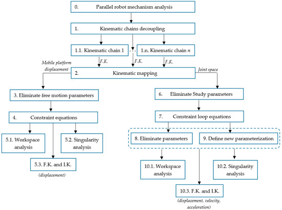 As illustrated in Figure 1, for mechanism analysis (step 0) using the study parameters method, the kinematic chains are decoupled (step 1) usually at the origin of the mobile platform, and the study parameters are defined for each of the n-th kinematic chain independently (steps 1.1–1.n), thus achieving the kinematic mapping (a concept that will be discussed further in the section) of the kinematic chains (step 2).