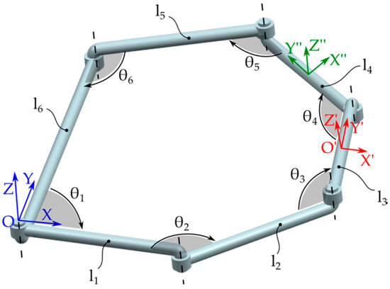 Based on the Equation (14), a new parameterization may be defined for the motion of the 6R mechanism. As an example, the relative displacement between the XYZ coordinate frame and the X’’Y’’Z’’ one is defined. To simplify the problem, only one solution group is chosen, namely the one that describes the “convex” working mode of the mechanism. The solution groups could be chosen based on technical needs, but, in principle, changing the working mode of the 6R mechanism will require the mechanism to pass through singularity, which in many applications must be avoided.