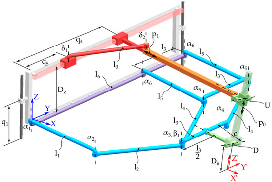 When considering the new defined parameterizations for the robotic system, the target in this case study is to define: the constraints of the point D [Xd, Yd, Zd] from the lower planar mechanism; the constraints of the point U [Xu, Yu, Zu] from the upper planar mechanism; and finally, the constraints of the mobile coordinate system X’Y’Z’ attached to the mobile platform of the robotic system (see Figure 4).