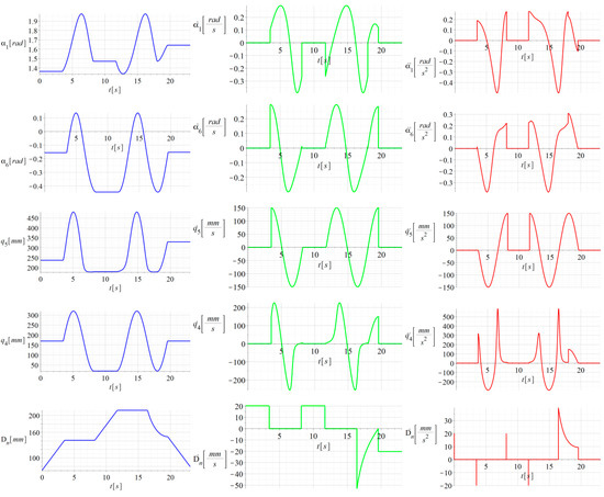 In order to compute the inverse kinematics of the PRO-HEP-LCT with respect to the trajectory previously defined, the mathematical conditions for the Cartesian coordinates of the mobile coordinate frame and the orientations were substituted in the kinematic models derived in Section 3. The trajectory between the points (1) and (2) is defined by a three quarters of a circle with 50 mm radius, whereas the trajectory starting (and ending) at point (3) is a full circle with 100 mm radius. The velocity for the linear insertion of the US probe was set to 20 mm/s and a maximum (absolute value) of 50 mm/s for the probe retraction; the velocity of the probe tip while guided on the curve from the point (1) to the point (2) was 12 mm/s, and the velocity of the probe tip while guided on the curve from the point (3) back to the point (3) was 32 mm/s. Figure 6 presents the results for the actuated joints (displacement, velocity, and acceleration). It is worth noting that no input profiles for the actuators velocities (triangle or trapezoidal profiles) were used in the computation. Although implementing these profiles is necessary for the development of the control system, the numerical results that are provided in this section are mainly used to validate the analytical models derived in previous sections.