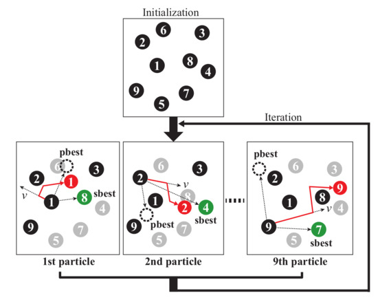 After initializing x i 0 , v i 0 , x pbest , i 0 , and x sbest , i 0 in Step 1, the following position and velocity update laws are applied to all particles ( i = 1 , 2 , , n p ):