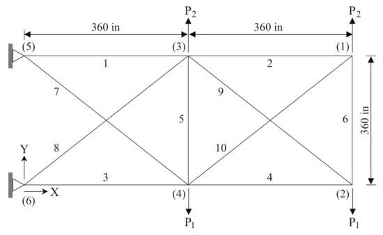 The first test problem regards the 10-bar truss shown in Figure 2. The Young’s modulus and material density of the truss members are 10 Msi and 0 . 1 lb / in 3 , respectively. The cross-sectional area of each member is included as a design variable. Two variants of this problem were considered: (1) Case 1: P 1 = 100 kips and P 2 = 0 ; (2) Case 2: P 1 = 150 kips and P 2 = 50 kips. The cross-sectional areas of elements were permitted to vary between 0.1 and 35 in 2 . The optimization problem includes 22 nonlinear constraints on element stresses (stress limit in tension and compression is 25 , 000 psi) and nodal displacements ( ± 2 in in both coordinate directions X and Y).