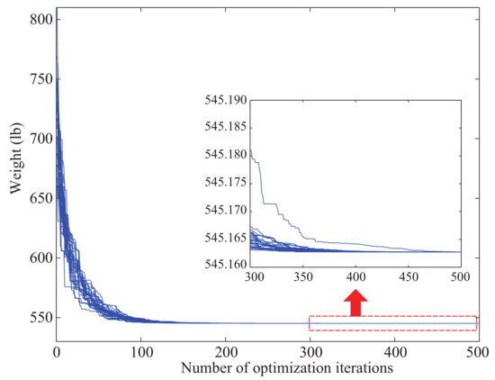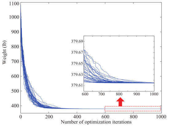 CNNT-PSO parameters were set as follows: n p = 200 and max = 500 . Feasible solutions were obtained for all 30 trials. The optimization results are compared with literature in Table 7. It can be seen that the present algorithm was the most efficient optimizer in terms of optimized weight and robustness. The statistical data given in Table 8 confirm that the optimal size of the neighborhood is about 10% of the population size. Figure 5 shows the convergence characteristics of the objective function for 30 independent optimization runs. However, for very small or large values of n s , CNNT-PSO could not achieve an adequate trade-off between population diversity enhancement and convergence speed.