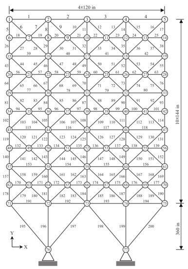 The final test case concerns the sizing optimization of the planar 200-bar truss with 77 nodes shown in Figure 8. The Young’s modulus of the material is 30 Msi and the material density is 0.283 lb / in 3 . Truss members were divided into 29 groups based on structural symmetry (see Table 11), and the cross-sectional areas of the bars in each group were included as design variables. This optimization problem includes 29 design variables and 1200 nonlinear constraints on member stresses (±10,000 psi). Cross-sectional areas must be greater than 0.1 in 2 . This truss structure was designed for three independent loading conditions: