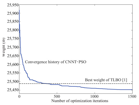CNNT-PSO was run with n p = 1000 and max = 1500 . All optimization runs were successful and converged to a feasible design. The convergence curve relative to the best optimization run is plotted in Figure 9. Table 12 shows that the present algorithm was once again the most efficient optimizer, as it designed the lightest structure and converged to a feasible design. Furthermore, the optimization results were marginally sensitive to trial runs. The optimal number of neighbors of each particle was once again about twice the number of design variables. It can be seen from Table 13 that a relatively accurate solution could be obtained by setting n s / n p to between 6% and 10%.