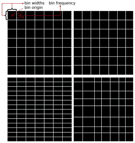 where is the volume occupied by the jth bin. The volume occupied by the bin of d-variate histograms are hyper-rectangles defined by the sides , , and the origins . Additionally, it is assumed that the bins in the histogram grid are not overlapping. Examples of different histogram grids are shown in Figure 1.