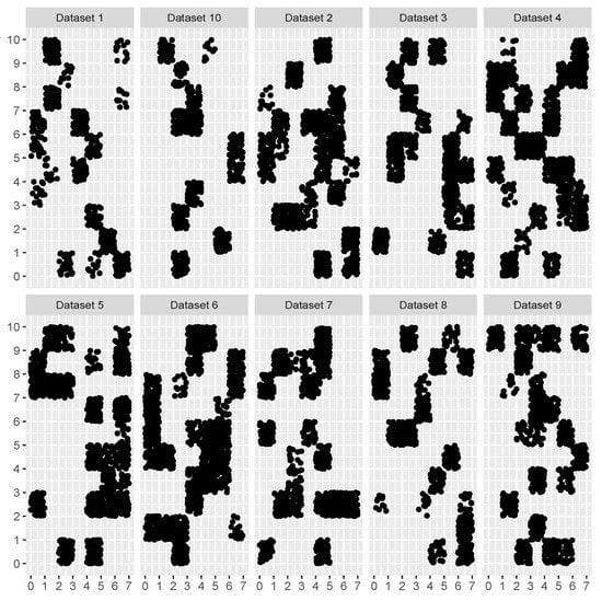 Two experiments were conducted to evaluate our proposals. For the first experiment, we simulated different datasets to evaluate the proposed algorithm for estimating the optimum histogram binning in conjunction with the Knuth rule as the optimization function. Datasets were simulated for , and numbers of dimensions. Simulations of the datasets were made in the following manner. A random number of observations was drawn uniformly on a unit hypercube in (length of each side was set to ). The number of observations to sample on each unit hypercube was drawn from a uniform distribution on the (10, 100) interval. The number of unit hypercubes was determined by the marginal number of bins in each dimension. For the , we have chosen ; for the we chose ; and for we chose . Thus, for we had hypercubes, for we had and for we had . To additionally increase the difficulty of the estimation process, we have chosen to leave some bins empty, i.e., the number of observations in some unit hypercubes was set to 0. Empty bins were also determined randomly; however, as the number empty bins increases, the problem becomes harder, and we have given a larger probability to an empty bin than for a populated bin. As the number of bins increased with the increase in the number of dimensions d, the probability of an empty bin was increased for each dimension, so in we used 0.75; in the probability of an empty bin was increased to 0.85; and for it was 0.95. Finally, for each dimension d we simulated 100 different datasets with a different seed number for a random generator. Examples of ten simulated datasets for are shown in Figure 2. To estimate the optimum binning with the Knuth rule we chose the following strategies. To ensure the best solution, at least when using the Knuth rule, is selected, we used the exhaustive strategy with and , and refer to this as EXHOPTBINS. The second strategy was the proposed coordinate-descent algorithm implementation in Algorithm 8 with and . This was referred to as OPTBINS. Additionally, some commonly used metaheuristic algorithms, the genetic algorithm and simulated annealing, were used. For the genetic algorithm we used the GA R package [30,31] and for the simulated annealing we used the optimization R package [32]. In what follows, the genetic algorithm is referred to as the GA, and simulated annealing as SA. For the GA and SA algorithms, and were also set. For other parameters for GA and SA, default values were used for corresponding R packages. Additionally, to ensure fair comparisons, we added the memoization principle in the GA and SA software implementation, so that only for newly visited parameter was the histogram evaluated.