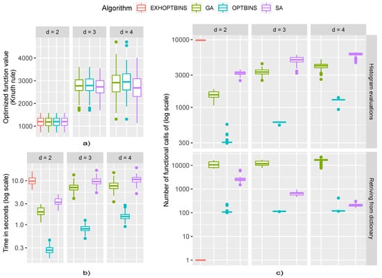 Finally, the box-plots given in Figure 3 provide some overview of the computational costs needed for each of the optimization algorithms employed. First, to confirm the results presented in Table 1 and Table 2 we have given the box-plots of the optimum function values, i.e., the values of the Knuth rule from Equation (22), in plot a of Figure 3. As can be seen, the optimization-function values for each dimension d of the dataset are equal, confirming the results presented before, i.e., most of the time all the algorithms selected the same optimum binning . Next, we gave both the computational times (plot b) of Figure 3 and the number of optimization-function evaluations (plot c) of Figure 3 for each algorithm and each dimension d of the simulated dataset. We added both plots to ensure fairer comparisons, as the computational times can be affected by the algorithm implementations and the programming language used. It is clear from plot b of the Figure 3 that the OPTBINS algorithm had many the shortest computational times. On other hand, the GA and SA algorithms had almost the same computational times. On plot c of Figure 3 we added two graphs, the upper giving the optimization-function evaluations, including the histogram estimations, which are the most wasteful, and the lower graph, giving only the number of calls to the shared dictionary from which the optimization-function value was retrieved in the case of the already-visited solutions. For the OPTBINS algorithm we can see that most of the calls were made on newly visited solutions; however, the number of optimization-function evaluations was the smallest. On other hand, both the GA and SA had many more optimization-function evaluations. In the end, as we can see, the number of times the GA algorithm revisited already visited solutions was exceptionally high; hence, the application of the memoization trick to the GA was definitely beneficial, whereas in the case of the SA the number of revisits was reducing with the dimension d, thereby implying the reduced benefit of the memoization trick.