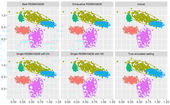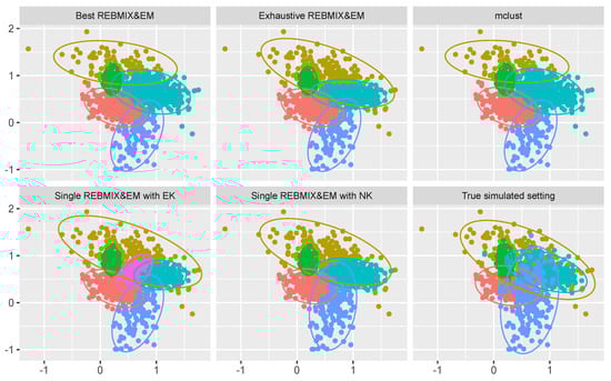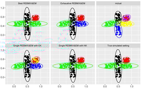 The results are given in Table 4 and Figure 7. Judging only by the BIC values and the estimated number of components c, the single REBMIX&EM strategy with EK had significantly poorer results than the other strategies concerning the quality of the Gaussian mixture parameter estimation. The single REBMIX&EM strategy with EK estimated the Gaussian mixture model with six components, which decreased the quality of the estimation. However, by inspecting Figure 7 it can be seen that only the exhaustive REBMIX&EM, single REBMIX&EM with EK and single REBMIX&EM with NK strategy had the best estimation of the mostly overlapping component in the Gaussian mixture model (the component that was colored yellow in Figure 7). The best REBMIX&EM strategy and mclust favored a smaller overlap between components. Additionally, only the single REBMIX&EM with the NK strategy had the best estimation of the blue component parameters. Thus, the value of ARI was higher than for the other strategies; however, not to any great extent. The value of ARI was not so convincingly high as in the previous case because of the large amount of overlap between the clusters in the simulated setting. As for the computational performance, the single REBMIX&EM with NK strategy had the smallest number of EM iterations and the shortest computational time. Again, the number of iterations and the estimation time for the exhaustive REBMIX&EM strategy was unadjustable, even though it had the second-best results and the best result obtained if compared to the BIC value (lower is better). The best REBMIX&EM strategy and mclust had good solutions with reasonable computation times. To conclude, even though the single REBMIX&EM strategy with EK estimated the Gaussian mixture model with six components, this solution is not poorer in terms of quality than the other solutions, as the estimation problem was hard.