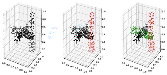 This example was used from the study in [36]. The dataset was simulated in and it gives two clusters of data, both of which belong to an object with a geometrical shape, cross and rectangular bar; see Figure 8. As the geometrical shape of a cross is impossible to recover within the Gaussian mixture-model clustering framework, the two-cluster solution would be inappropriate to use (the study in [36] was aiming to combine the mixture-model components in order to obtain such complicated clustering solutions). Hence, we adopted the three-cluster solution as ideal, which was also reported in [36] as one of the optimum Gaussian mixture models selected by the model-selection procedure with the BIC criterion in their study. For convenience, we added a top-down view of the dataset in Figure 9. This dataset increases the difficulty, as it has a substantial overlap between clusters, and additionally the dimension of the problem is higher. Furthermore, there were fewer observations in this dataset; i.e., .