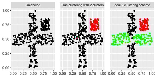 Top-down view of cross dataset from [36]. The first plot gives the unlabeled observations; the second plot gives the true two-cluster clustering; and the third plot gives the ideal three-cluster clustering.