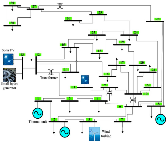 An adopted IEEE standard 30-bus system, that comprises thermal generators and renewable energy sources, is investigated in this work. As shown in Figure 1, the model comprises three thermal power generation units (TPGUs) installed on buses 1, 2, and 8, in addition to three different VRESs, namely wind, PV, and a hybrid power generation system of PV and small hydropower (PVSH) installed on buses 5, 11, and 13, respectively. The main parameters of the investigated system are given in Table 3.