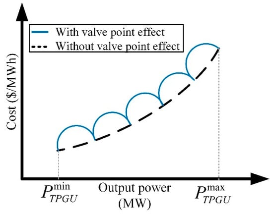 The TPGUs cost, in dollars per megawatt-hour ($/MWh), should consider the flow of steam to the turbine blades and also the sudden changes in the valve’s status. Steam in these plants is controlled by valves to run the turbine through a separate set of nozzles. That group of nozzles must be run at full output to achieve the best efficiency [29]. For the mandatory production, the valves are opened sequentially, which results in the discontinuity cost curve as shown in Figure 3. The cost function of TPGUs is given in Equation (3) [30].