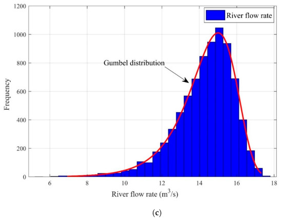 Gumbel distribution [35] is applied to fit the river flow data, as shown in Figure 4c, in which the river flow rate probabilistic that follows the Gumbel distribution with locational factor λ and the scaling factor γ is expressed as follows: