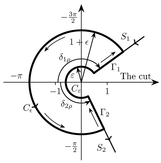 We represent the complex parameter μ in the form and make use of Lemma 1. According to this lemma, the function at values and , where has one singular point which is a pole of the first order. The point , in this case, is the regular point. In case, if and , where the function has two singular points: the point is a pole of the first order and the point is a pole of the order . As we can see, in both cases the point is not a branch point. As a result, in these two cases, the function is the entire function of a complex variable ζ. From here it follows that when , and , where the arc of the circle that enters the contour (31) is the closed circle of radius . The half-lines and pass along the positive part of a real axis in mutually opposite directions. With all other values of the parameter μ (when or ), according to Lemma 1, the point is a branch point of the function . In this case, the circle of the contour (31) will not close up and half-lines and will go along the upper and lower banks of the cut of the complex plane which runs along the positive part of a real axis.