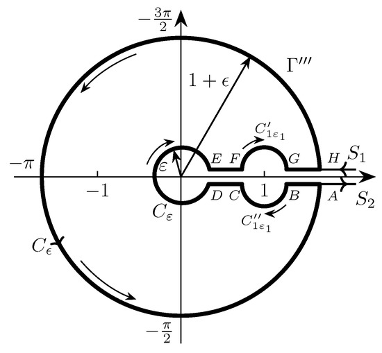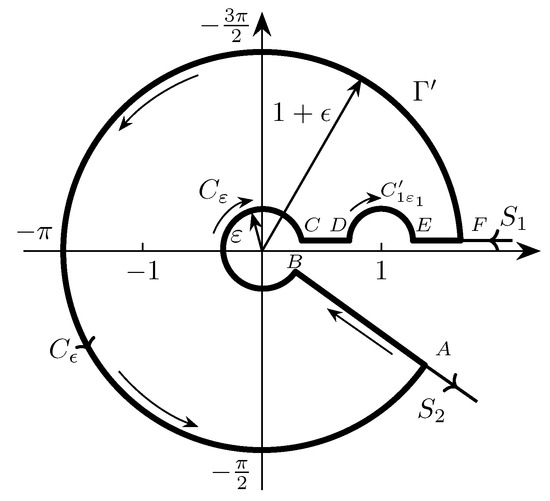 Case 4. Consider now the case , . In this case the segments and of the auxiliary contour (see Figure 2) run along the positive part of a real axis. However, the argument of these segments differs by the angle . Thus, the segment passes through a singular point , and the segment passes through a singular point (). Consequently, the contour must be changed so as to bypass these two points leaving them outside the contour.