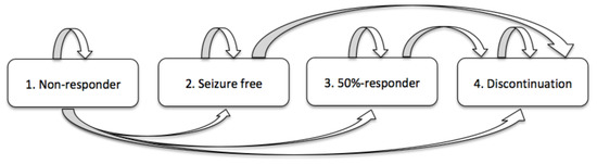 In this paper, we study from a probabilistic point of view the effectiveness of AEDs in epileptic patients. This analysis will be done in general for any treatment. We adopt a 2-year time horizon, as usual in epileptic studies. Due the severity of the health state among involved patients, a longer time perspective would be apprised as too uncertain. And, a shorter time horizon leads to limited comparability with previous relevant studies. We consider that patients are in any of the following states: 1. Non-responder (experiencing a reduction in seizure frequency less than 50%); 2. Seizure free; 3. Partial or 50%-responder (more than 50% reduction in seizure frequency); 4. Discontinuation. Patients discontinue the adjunctive treatment for seizures in case of adverse effects and they stay on standard monotherapy for the remaining two years. In Figure 1 the health stage transition of an epilepsy patient treated with AEDs is represented [10,11]. Notice that only relevant clinical transitions are considered in our study.