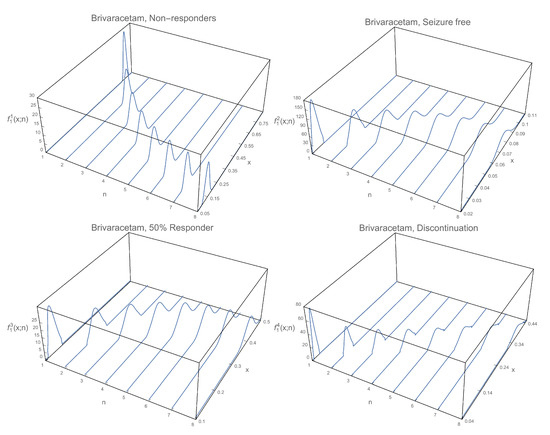 Plot of the 1-PDFs in each of the four states described in Figure 1 with the Brivaracetam treatment. (Up): Non-responders (left) and Seizure free population (right). (Bottom): Partial responders (left) and population with discontinuation symptoms (right).