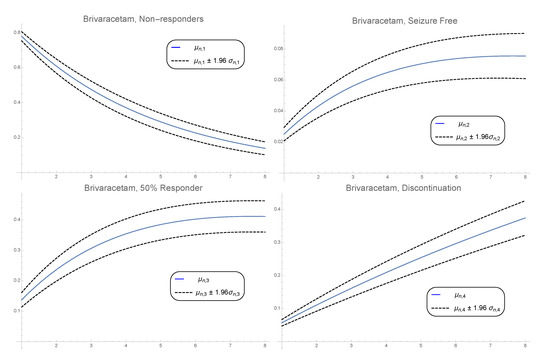 Then, for Brivaracetam AED , and . Now, we assume that , and are independent absolutely continuous RVs. In order to establish the PDFs of each RV we consider that the corresponding deterministic values are perturbed. Then, we choose for each RV, a Beta distribution , with