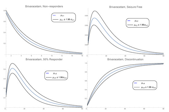 Plot of the expectation (Blue line) plus/minus 1.96 standard deviation (Black dashed line) of each of the four states described in Figure 1 with the Brivaracetam treatment for greater times. (Up): Non-responders (left) and Seizure free population (right). (Bottom): Partial responders (left) and population with discontinuation symptoms (right).