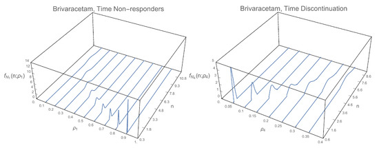 Now, we calculate the PDFs of time until a fixed proportion of the population remains in each of the states described in Figure 1. As it was pointed in Section 2.2 the exact expression of these functions have been determined in the cases of non-responders and patients with discontinuation symptoms. In Figure 5 both PDFs are shown for different values of and . As before, from the PDF we can compute the mean for a fixed proportion. For example, for non-responders, the expectation of RV for is computed as follows,
