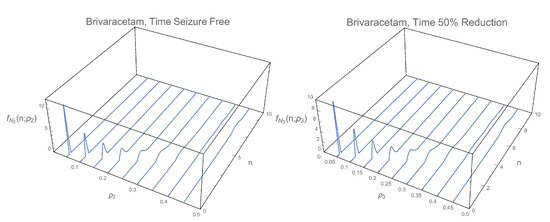 Plot of the PDFs of the times, and , until given proportions, and , remain in the corresponding state, respectively. (Left): Seizure Free. (Right): 50% Responder.