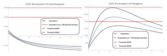 Plot of expectation plus/minus 1.96 standard deviation functions of ICER for . (Left): Brivaracetam VS Eslicarbazepine. (Right): Brivaracetam VS Retigabine. The red straight line represents the threshold value 20,000€/QALY.