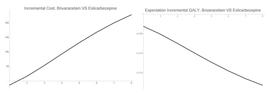 Comparison between Brivaracetam and Eslicarbazepine AEDs for . (Left): Incremental cost. (Right): Expectation incremental QALY. In both increments Eslicabazepine is considered the first treatment.