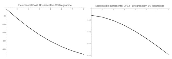 Comparison between Brivaracetam and Regitabine AEDs for . (Left): Incremental cost. (Right): Expectation incremental QALY. In both increments Regitabine is considered the first treatment.