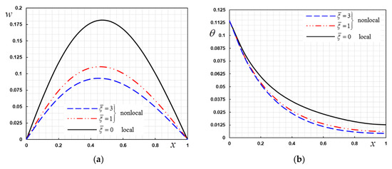 Figure 2a–d illustrate the variety of the dimensionless studied fields of the system versus the distance when , and . The figures clearly show the influence of the nanoscale parameter on the dynamic deflection and other fields of the nanobeam. When taking the nonlocal parameter as , the governing equations of the nonlocal theory are reduced to the original local theory. As shown in Figure 2a, when is increased from to , the dynamic response of the deflection changes from a softening to a stiffness type behavior. It is also detected that the deflection vibration of the nanobeam corresponds to the midpoint and meets the boundary condition at the two ends . Figure 2b demonstrates the temperature profile of the thermoelastic nanobeam for different values of the nanoscale parameter . From the figure, it is found that that temperature decreased over time, which means the mechanical energy of the nanobeam is wasted in the form of thermal energy. Additionally, by increasing the values of , we note a decrease in the temperature profile.