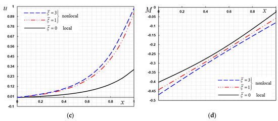 From Figure 2c, it is observed that an increase in the value of parameter results in an increase in the dynamic displacement profile. The bending moment increases as the distance increases, as is shown in Figure 2d. It can be seen from Figure 2d that the bending moment increases with an increase in the nonlocal parameter . In previous research [23,24], they found that all the studied fields of the nanobeam clearly depend on the nanoscale parameter . Now, our calculation demonstrates that this phenomenon is also valid for various values of the parameter .