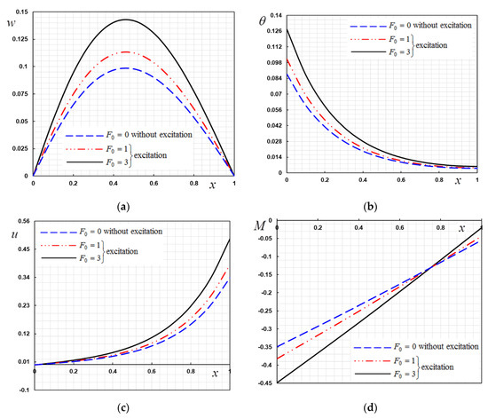 In Figure 3a–d the variation of the studied fields of the beam with respect to the magnitude of the forcing excitation is shown. In the following case, we take the values of the parameters , and , respectively, as [26]. One can see from these figures that the effect of the forcing excitation has pronounced influences on the distribution of all studied fields. Additionally, it can be seen that the increase in the value of the forcing excitation causes an increase in the thermodynamic temperature values, displacement and the lateral fields, which is evident in the peak points of the profiles. This result is consistent with the results of [18,20]. It is clear from Figure 3d that the bending moment decrease when the forcing excitation is increased. The value of indicates no forcing excitation, while other values indicate the harmonic forcing excitation.