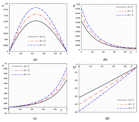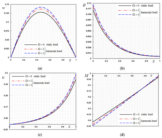 The variation in the dimensionless field quantities with the external excitation frequency are shown in Figure 4a–d. The value of indicates the static forcing excitation, while other values indicate the harmonic forcing excitation. It is apparent from these figures that, when the excitation frequency coefficient is increased, the amplitude of the studied fields increases. The data would seem to suggest that increasing the amount of angular frequency causes a decrease in both the static equilibrium position and the amplitude of the response. When an external harmonic excitation is applied to the nanobeam, the field quantities are more sensitive to the excitation frequency . The results obtained in our research are found to be in good agreement with [18]. In Harrington et al.’s research [29], they found that the temperature changes with the resonance frequency of the external excitation.