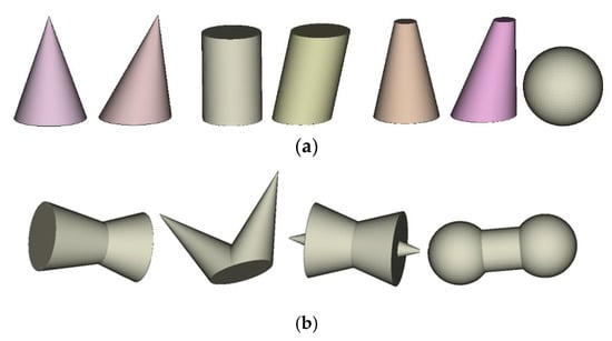 Assume that , where denotes a basic object from a family of oblique and right circular cylinders, cones, truncated cones denoted by and spheres (Figure 2a). An object for is referred to the composed object (Figure 2b).